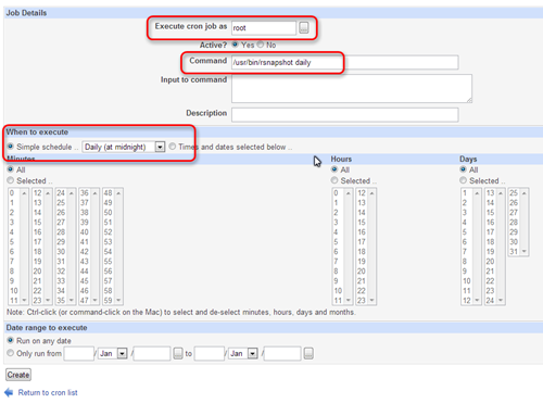 Rsnapshot command needs to be excuted in order to run automatically. Now, we need to add the rsnapshot command to crontab. Since I am bit confuse with contab command/syntax, I use webmin to configure the automatic execution of this rsnapshot. Please follow this instruction to install webmin on ClearOS.